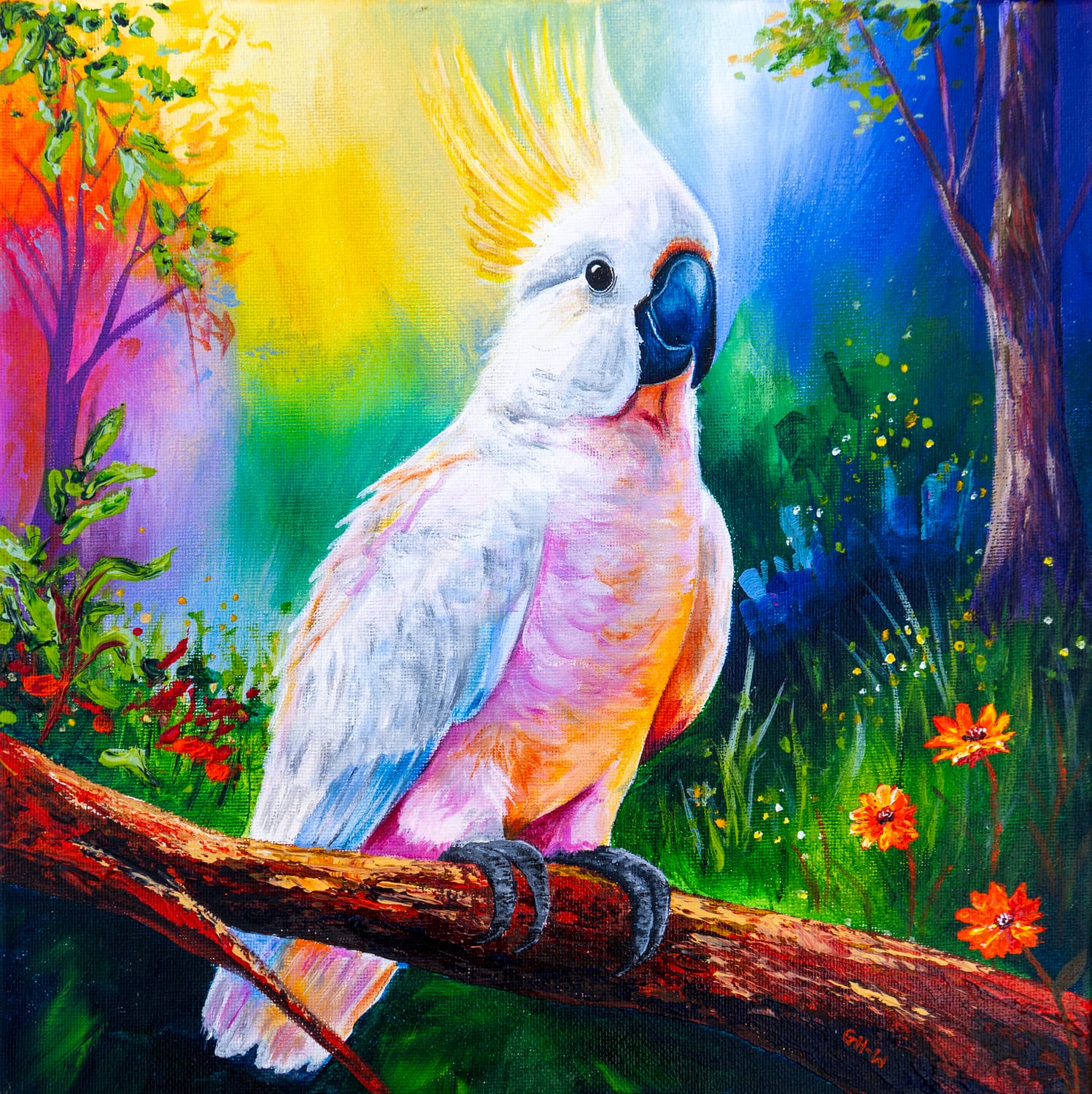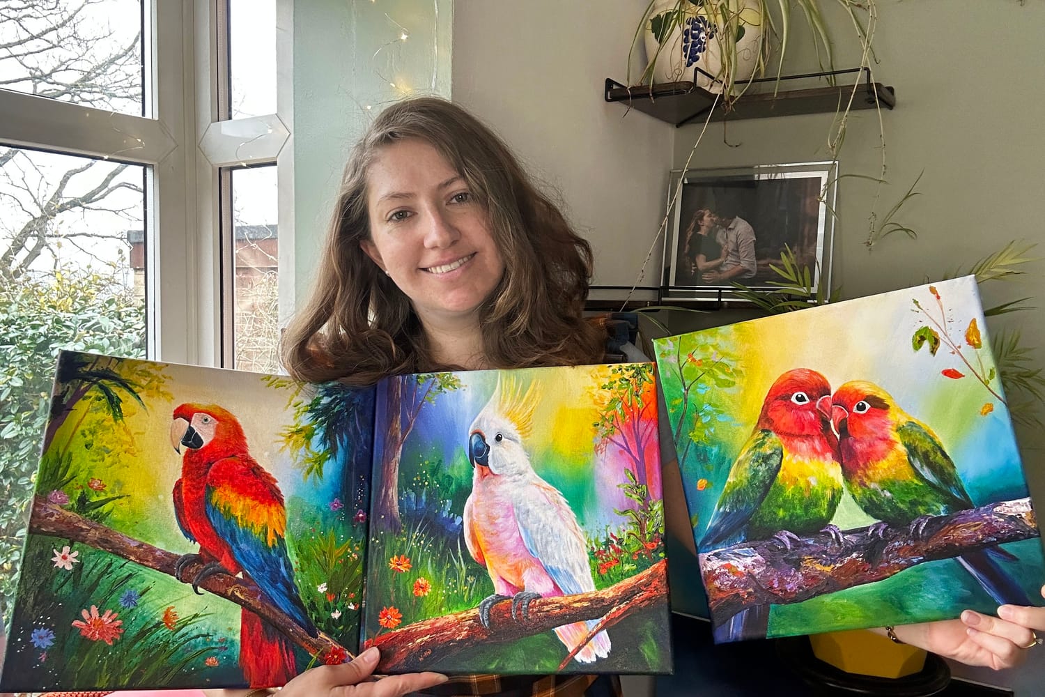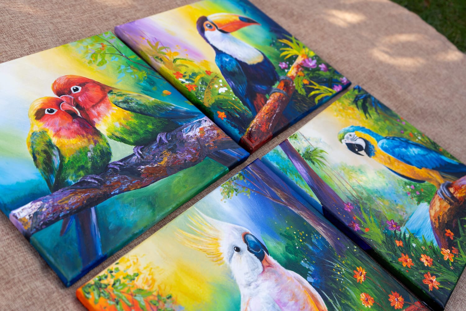 Birds became a natural subject for this collection. Their personalities are as vivid as their plumage — curious, playful, unapologetically bold. Painting them allows me to combine intricate detail with expressive colour and texture, building layers with acrylics and palette knives to create depth and movement.