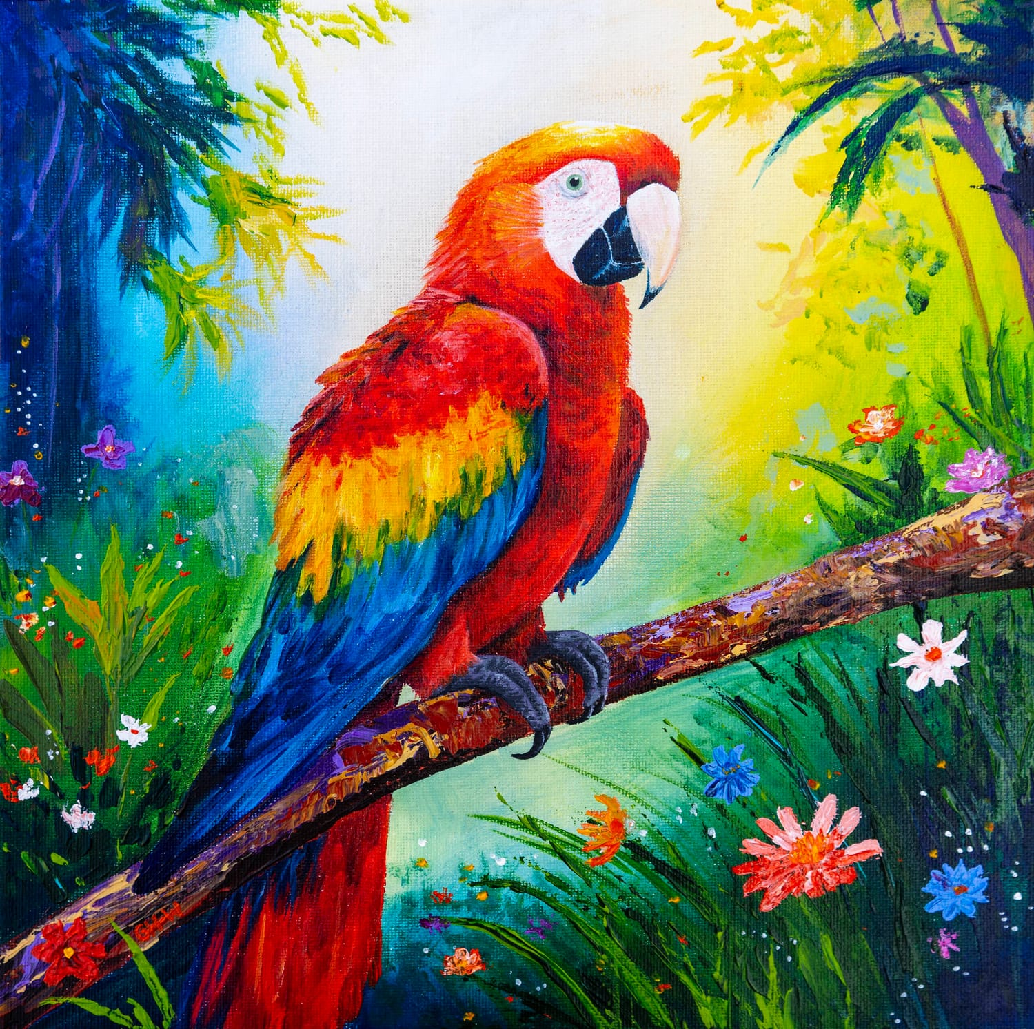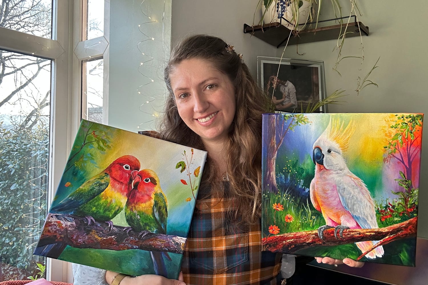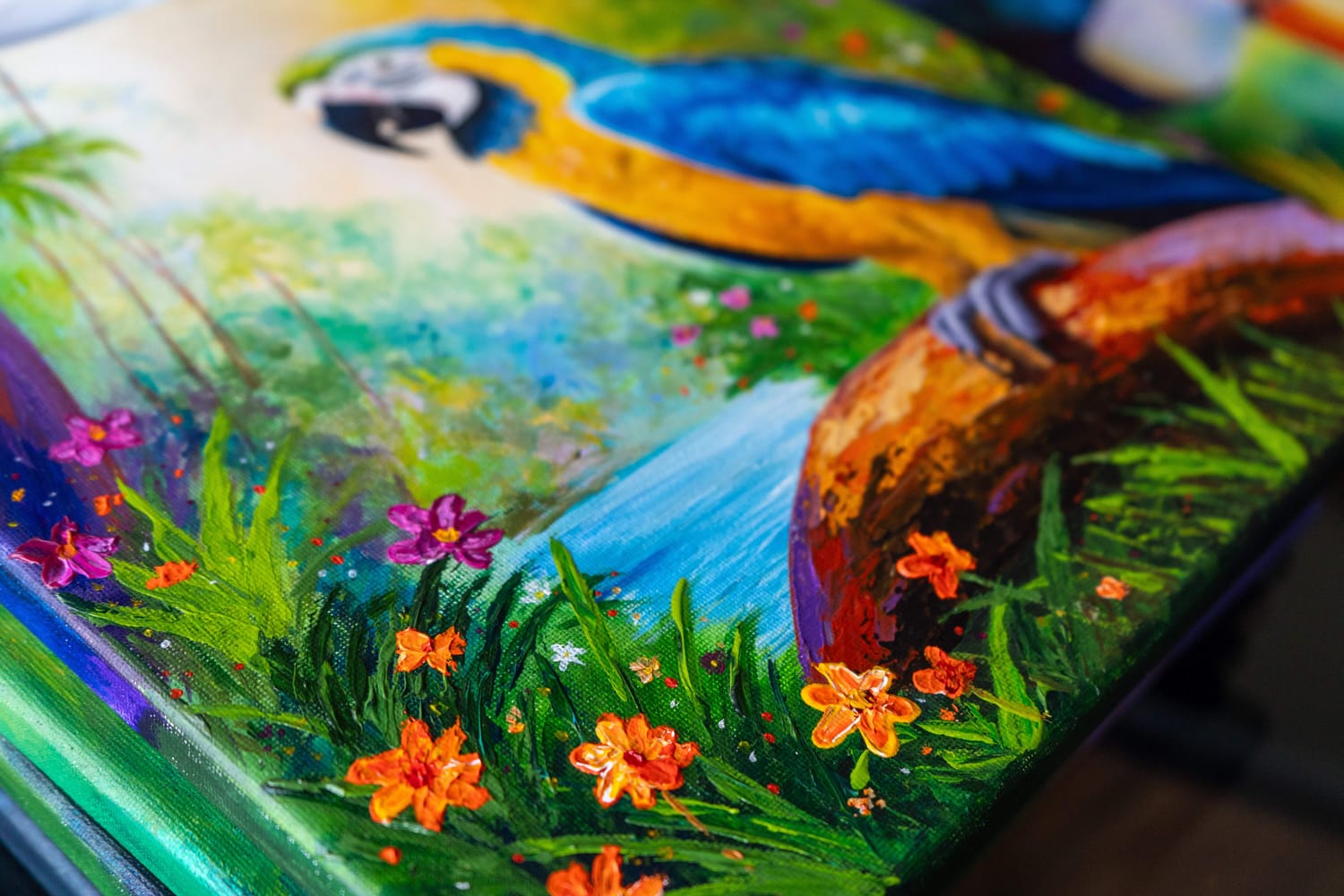 Birds became a natural subject for this collection. Their personalities are as vivid as their plumage — curious, playful, unapologetically bold. Painting them allows me to combine intricate detail with expressive colour and texture, building layers with acrylics and palette knives to create depth and movement.