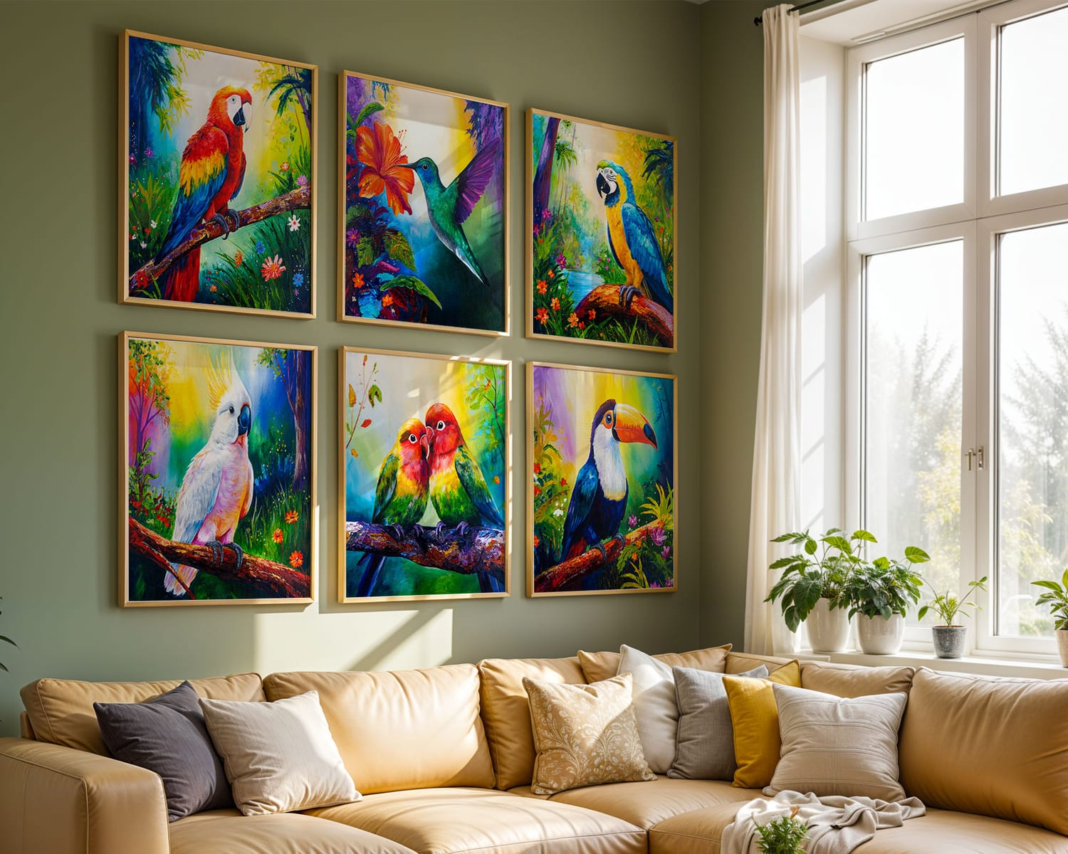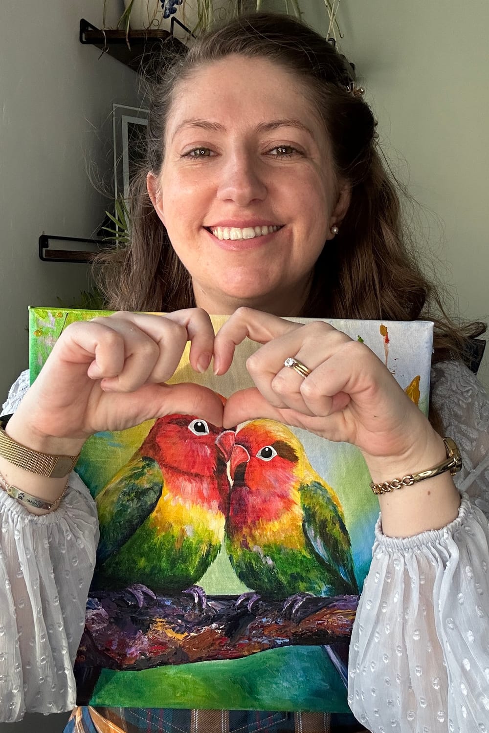 The Lovebirds - they're oblivious to what's going on around them, only interested in each other's company. Snuggled and nuzzled, they're there for each other with an unshakeable bond of true love. A colourful celebration of connection and joy, perfect for a living space that welcomes love and laughter.