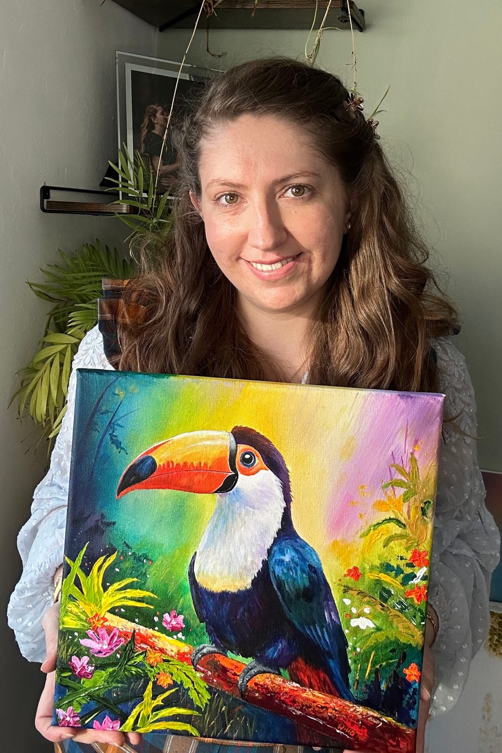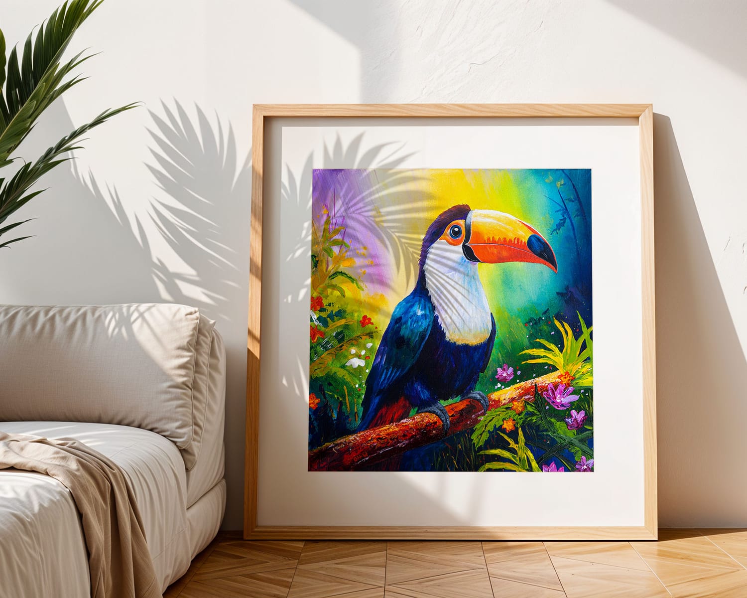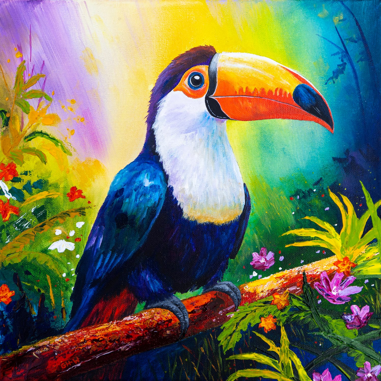 Bold, cheeky, and impossible to ignore, this Toucan struts its tropical colours with unapologetic confidence. Palette knife textures create a vibrant surrounding. A playful, joyful statement piece designed to make any room smile.