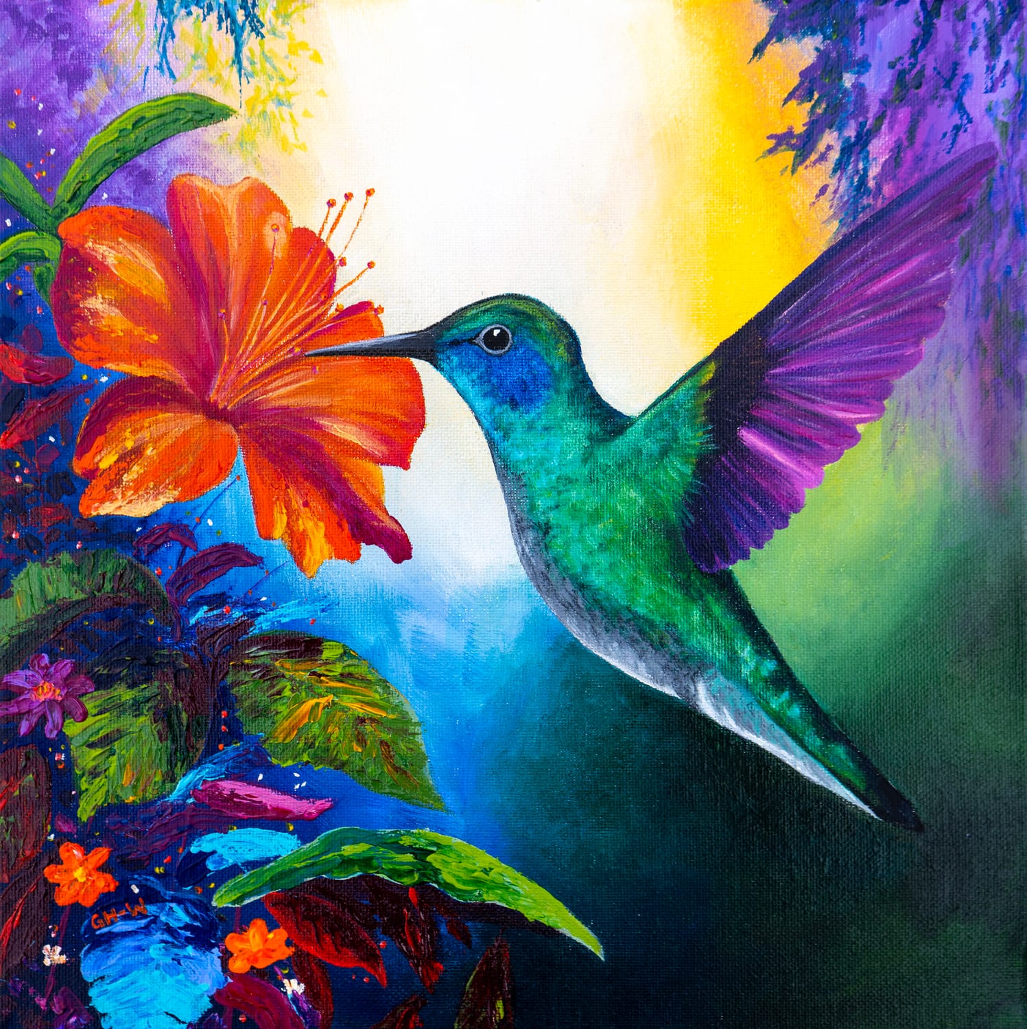 A tiny jewel in flight, this Hummingbird is all energy, sparkle, and iridescent beauty. Its vivid greens and blues shimmer, her wings fluttering like the thrum of her tiny heartbeat - she's a fleeting moment frozen in time.